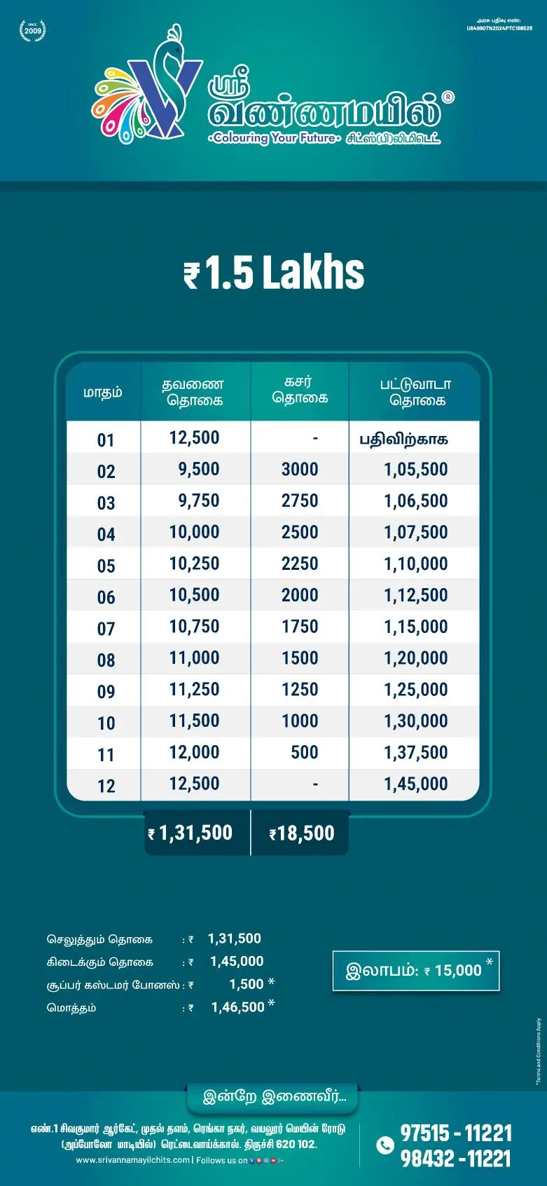 This is a 12-month chit fund scheme with a total value of ₹1,50,000. Your contribution will be ₹1,31,500. Upon successful completion of the scheme, you'll receive your total contributions back and enjoy an additional bonus of ₹18,500!