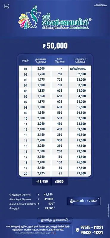 This is a 12-month chit fund scheme with a total value of ₹50,000. Your contribution will be ₹41,950. Upon successful completion of the scheme, you'll receive your total contributions back and enjoy an additional bonus of ₹8,050!