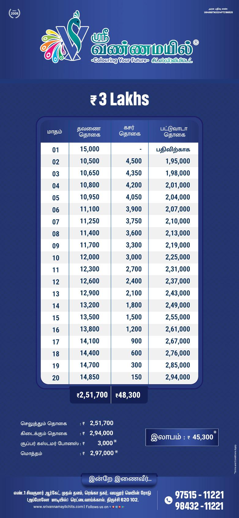 This is a 12-month chit fund scheme with a total value of ₹3,00,000. Your contribution will be ₹2,51,700. Upon successful completion of the scheme, you'll receive your total contributions back and enjoy an additional bonus of ₹48,300!
